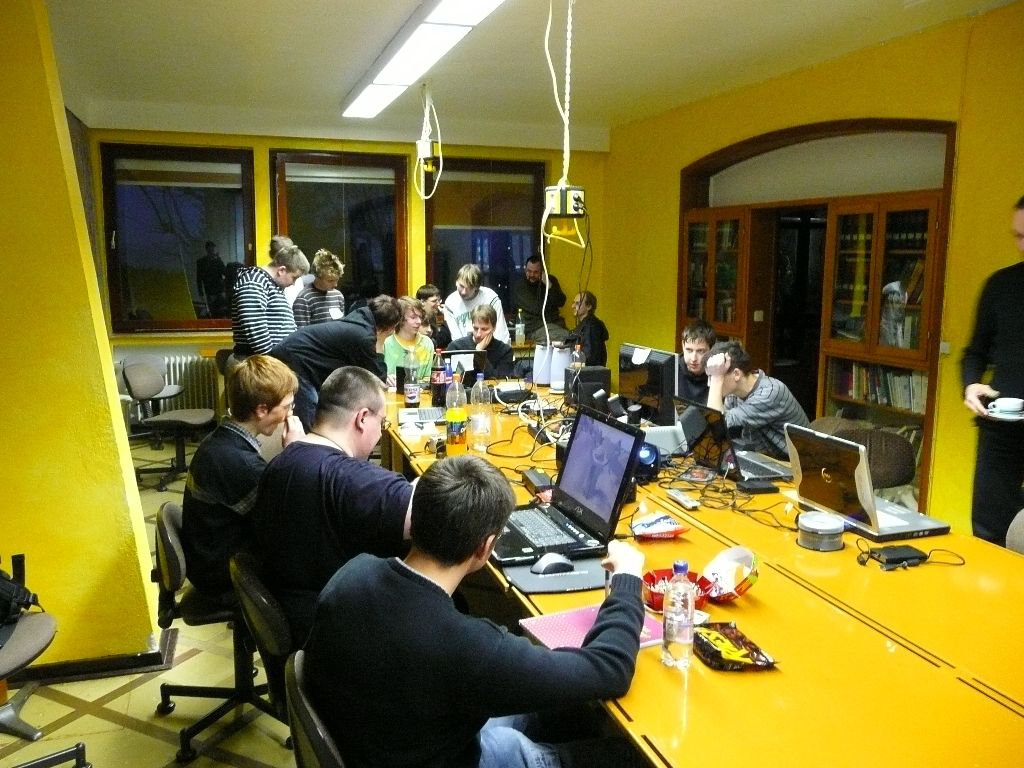 Im Raum waren etwas mehr als 15 Personen, 3 oder 4 Laptops waren schon aufgebaut und auf einigen Desktops erkannte ich schon altbekannte Programme.