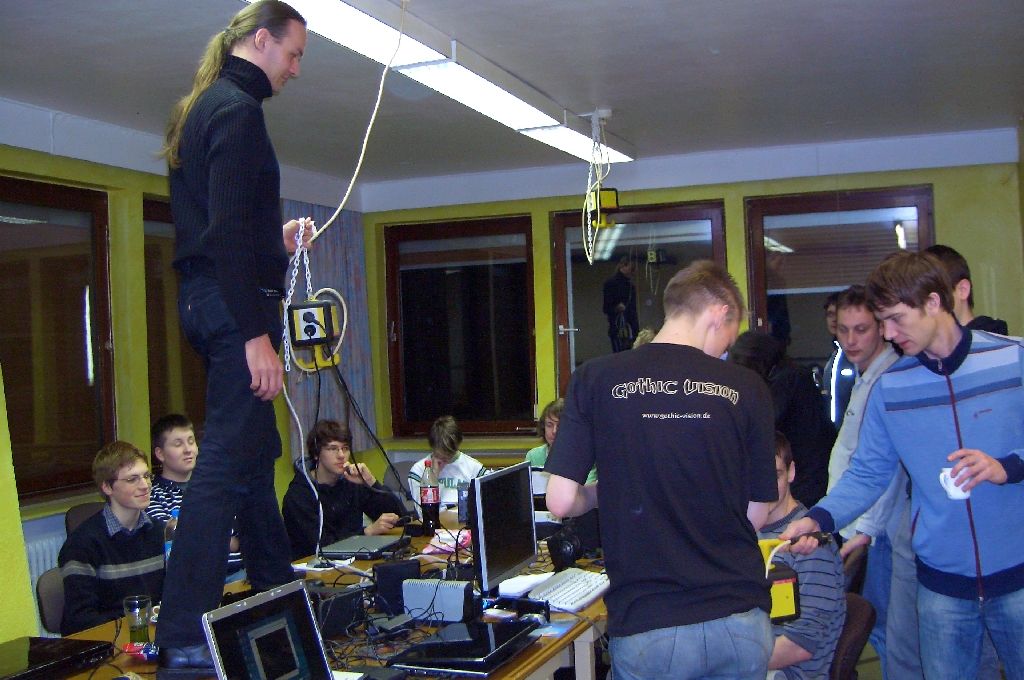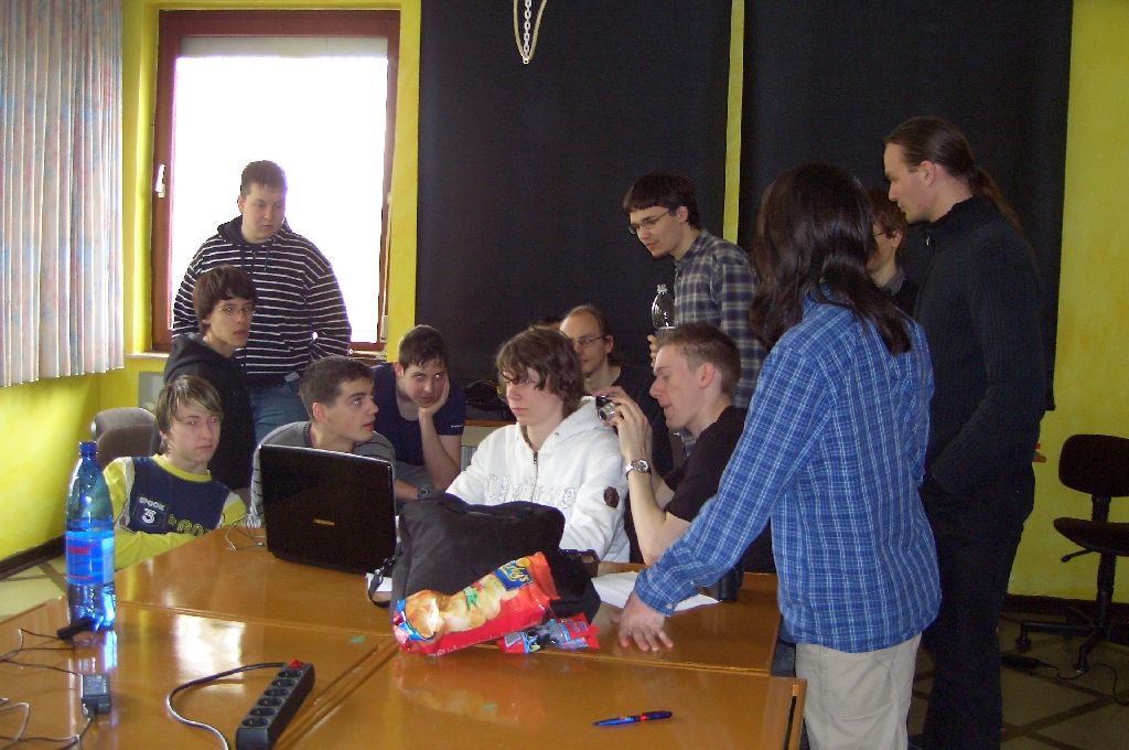 In diesem Zusammenhang sollte erwähnt werden, dass es eine kleine, aber dennoch witzige Panne gab: Als der Beamer genutzt werden sollte, meinte ein hier nicht näher genannter Teilnehmer, dass man doch das Licht ausmachen solle. Freddy hat das dann gemacht, nur wusste keiner, dass die Steckdose, an die jeder seinen Computer angeschlossen hatte, mit an der Lampe hing. Also war nicht nur der ganze Raum dunkel, sondern auch einige der Bildschirme. Übrigens ist dies auch die Vorgeschichte zu Nicos "Tabledance".