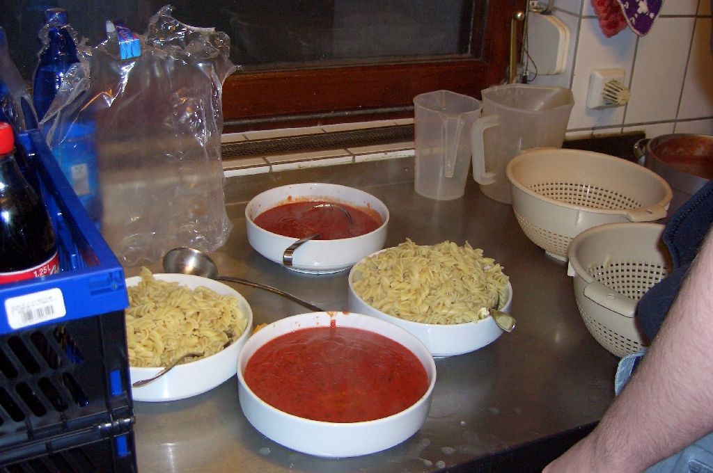 Schließlich - es wurde schon langsam etwas später - stand Schreiberling auf und sagte wörtlich: "Ich geh jetzt kochen." - nach kurzem Zögern folgten ihm auch noch ein paar Helfer und gingen Nudeln mit Tomatensoße kochen (sechs Packungen Nudeln - der Topf hat fast nicht ausgereicht).