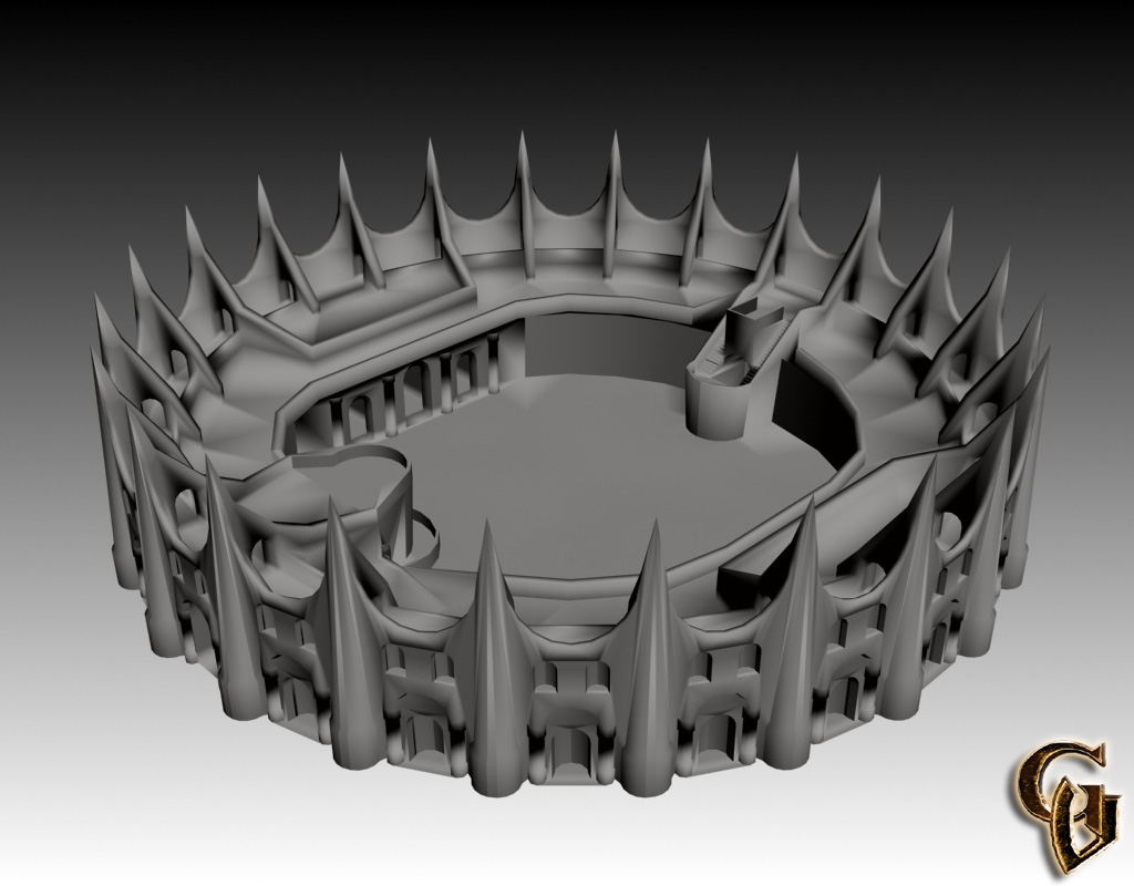 Sobald ich dann ein bisschen hin und her probiert habe, entstand auch schnell ein architektonisches Thema für die Eingangshalle und die nachfolgenden Räume und Gänge. Auch der Kampfplatz und die Sitzreihen und Logen gingen schnell vonstatten, nur bei den nach oben hin spitz zulaufenden Stützpfeiler in Inneren des Rahmens gab es noch mal einige Probleme, zum Teil dadurch, dass ein Durchlass geschaffen werden musste, durch den der Weg zu den Logen führt, aber auch daran, dass ich viel kopieren und verschmelzen musste und schnell merkte, dass ich teilweise sehr ungenau gearbeitet habe. Nun ja, aus Fehlern lernt man und schließlich war auch die Arena fertig. Das Mesh an sich hat um die 20.000 Faces, eine noch hoffentlich vertretbare Summe, und ist nur unbedeutend kleiner als das alte Lager (Ich war selbst ziemlich überrascht ).